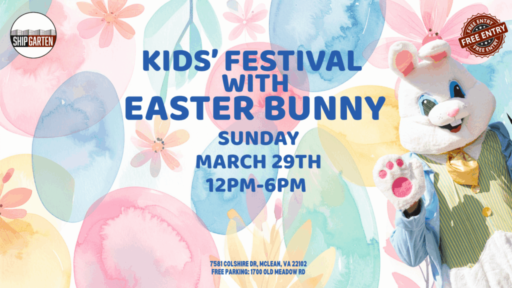 Step into a world of family-friendly fun at Shipgarten, Tysons Corner, the top restaurant for families! Join us on Sunday, March 29th , from 12 PM to 6 PM, as we invite you to enjoy a day of excitement as we are having The Easter Bunny Host the Kids and Family Festival. Bring the whole family for an unforgettable experience! For your little ones Shipgarten has face painting and arts & crafts, allowing their creativity to shine. The fun doesn’t stop there – we’ve got live music, great drinks, moonbounces, and a full outdoor playground to ensure everyone has a blast. Dogs are more than welcome at Shipgarten, whether on-leash or in our off-leash dog park. Treat your furry friends to Pup Cups and Kongs filled with peanut butter for a delightful family treat.