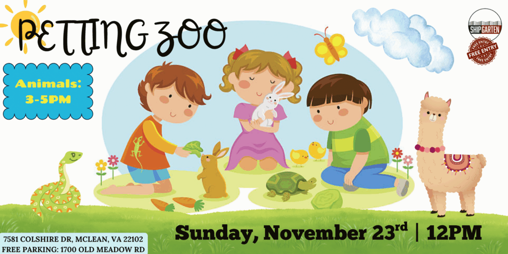 Step into a world of family-friendly fun at Shipgarten, Tysons Corner top restaurant for families! Join us on Sunday, Nov 23rd from 12PM to 6 PM, as we invite you to enjoy a day of excitement as we are having the Petting Zoo Host the Kids and Family Festival. Bring the whole family for an unforgettable experience! For your little ones Shipgarten has face painting and arts & crafts, allowing their creativity to shine. The fun doesn’t stop there – we’ve got live music, great drinks, moonbounces, and a full outdoor playground to ensure everyone has a blast. Dogs are more than welcome at Shipgarten, whether on-leash or in our off-leash dog park. Treat your furry friends to Pup Cups and Kongs filled with peanut butter for a delightful family treat.