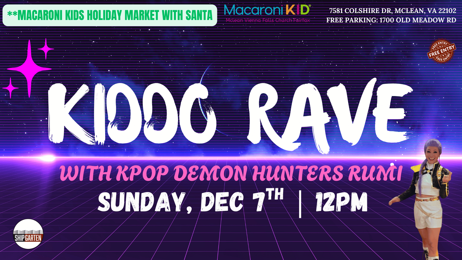 Shipgarten is bringing a new kind of FAMILY FUN to Tysons with its very own KIDDO RAVE! On Sunday, Dec 7th from 12-6PM, we will be playing the best kids dance songs and remixes. Bring the whole family for an unforgettable experience dancing to your favorite songs with bubbles, glow sticks, glow in the dark tattoos, face painting, and arts & crafts kids can enjoy. We also have moonbounces and a full playground so everyone can have a blast! Dogs are welcome at Shipgarten too, whether on-leash or in our off-leash dog park! We offer lots of treats such as Pup Cups and Kongs filled with peanut butter so the whole family can enjoy a treat. ***Shipgarten opens at 11 AM & the festival runs from 12 PM until 6 PM. Restaurant closes at 2 AM***   EVENT SCHEDULE: 12-3pm: Balloon animals and magic tricks 1pm: Magic Show by Jake the Great 12-6pm Kiddo Rave with Bianca Diamond 12-6pm Face Paint, Arts & Crafts, Moon Bounces 1-4pm Macaroni Kids Holiday Market 3:15pm: Live performance by Rumi   ADDITIONALLY: ★ 2 Brand NEW Moon Bounces ★ 2 Playground sets ★ Photo Booth with Accessories ★ Kids’ Corner with Face Painting, Crafts, and More ★ Outdoor Games & Activities ★ Giveaways, Competitions & Prizes ★ Dog Friendly (Check out our Dog menu, play in the dog park, or just bring your pup along) ★ Mocktails ★ Great food ★ Glow in the dark tattoos ★ Bubbles everywhere ★ Glow Sticks ★ Hopscotch What to expect: • Strollers should not be taken onto the dance floor in case of tripping. Strollers must be parked outside.• Slings or baby carriers are recommended.• Please note parents remain responsible for children at all times. Children must remain under adult supervision and we kindly request no running.• Shoes must be kept ON at all times except when in the moonbounce. • Music is kept at safe levels at all times in line with our risk assessment guidelines. Please note it is still loud so bring ear defenders if you wish.• Expect kid-friendly club lighting in a festival style environment.• No external food or drink is permitted on site, we have tons of kid friendly food optionsAttire: Whatever you like to dance in! Costumes are welcome but not required.