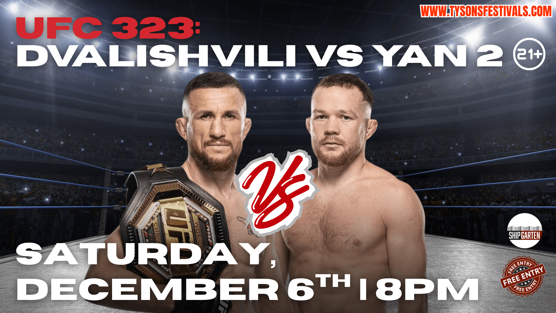 Get Ready for an Adrenaline-Packed Showdown! Join us at Shipgarten for the UFC 323 Watch Party — where the hits are harder, the crowd is louder, and the energy is unmatched! Experience every knockout, submission, and intense moment as UFC 323 brings a stacked card of elite fighters to the octagon. This isn’t just a watch party — it’s an all-day fight festival for true MMA fans! Featured Fights A rematch for the bantamweight title between champion Merab Dvalishvili and former champion Petr Yan in the main event, and flyweight champion Alexandre Pantoja defending his belt against Joshua Van in the co-main event.